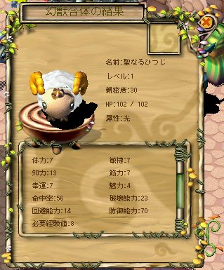 所持幻獣 :闇ショコラ(18)、火剣(60)、火桃太郎(30)、闇クラゲ(31)、葉ねずみ(24)、光ホリター(23)